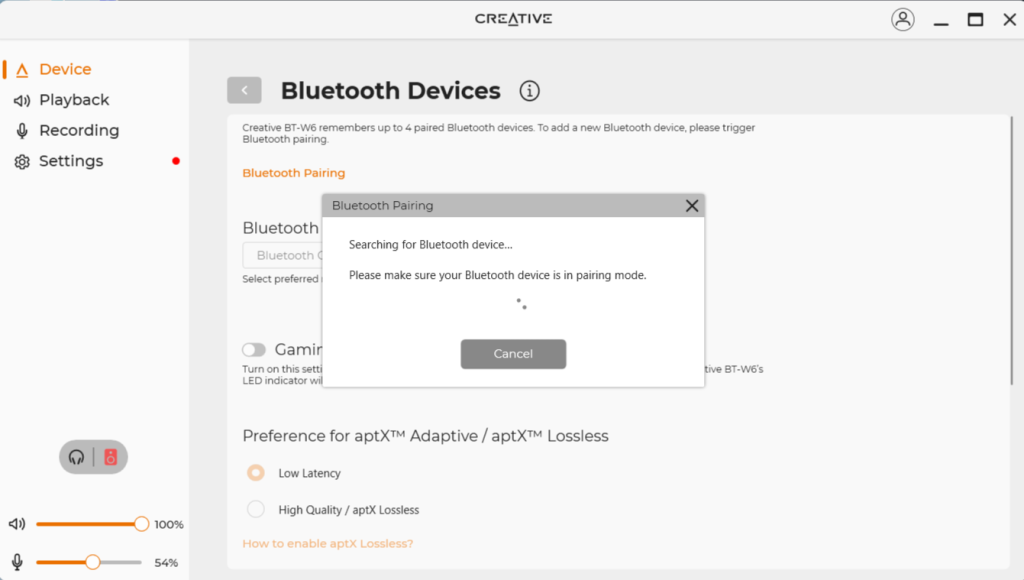 We contacted Creative’s help desk to find out more about the dongle’s connection capability, especially as its own website states: “The Creative BT-W6 is able to pair and connect with receivers that support either Classic Bluetooth, LE audio or dual mode.”